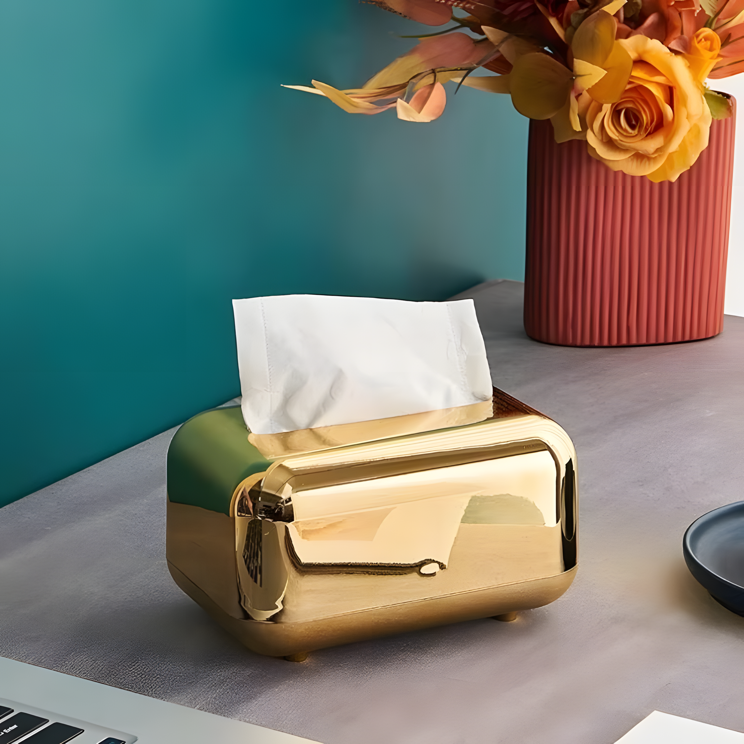 Elevate your space with the Opulent Gilt tissue container—a masterpiece that seamlessly blends luxury with function. Its striking gold finish brings an air of opulence, making this tissue holder more than just a necessity, but a statement piece. Designed to fit effortlessly into any setting, it adds a timeless elegance to your living room, office, or bathroom. With its sleek, gilded design, this piece brings sophistication to the simplest tasks.
